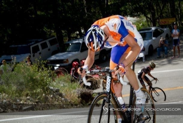 The two leaders continued to work together as they headed toward the base of Mt. Baldy one minute, 25 seconds ahead of the nearest chasers. The BMC Racing Team continued to push the pace at the front of the peloton. As Atapuma attacked and Horner responded, Gesink moved out in front of the peloton, attempting to catch the race leaders alone. He was followed by Danielson and van Garderen. Gesink and Danielson rode ahead of van Garderen, with Gesink just 35 seconds behind Atapuma.