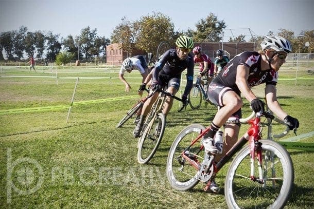 Things got a little wild and loose early in the Men’s A race at the Pacifica Crossfest, round three of the SoCalCross Prestige Series at Casa Pacifica in Camarillo, CA. In the middle of the lead group, Cory Greenberg (Cynergy, in white) got together with Brandon Gritters (Rock n Road, in black). The resulting mosh pit saw both hit the sod, with Brent Prenzlow (Celo Pacific, in red) barely avoiding the mess. Amazingly, Prenzlow ended up winning, Gritters was second and Greenberg 11th.