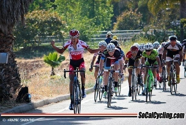 The 26th edition of the San Luis Rey Road Race was held on a challenging course in the hills of Bonsall that included 15 mile laps with 400′ climb over the last 2 miles. The cumulative climbing and heat took a toll on the riders throughout the day and made it tough man’s (and women’s) course.