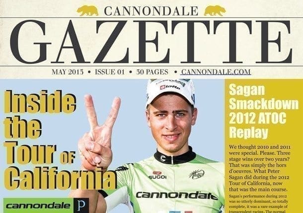 Cannondale has gone digital and will launch the Cannondale Gazette California Edition for the Amgen Tour of California. In partnership with Peloton Magazine, Cannondale has brought the excitement of Cannondale Pro Cycling and the race to fans all over the world. The free digital newspaper will be available for download on May 8 at cannondale.com/california and will provide readers with a dynamic overview of the Tour of California, including amazing imagery, detailed information on the race and surrounding regions of California, unique giveaways, videos and interviews with the Cannondale Pro Cycling team.