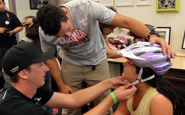 Above Photo: BMX Star Steve McCann and Joseph Tolle, RN assisting with ThinkFirst Los Angeles County, LAC + USC Medical Center, fitting Ruby Martinez with her new Schwinn helmet.