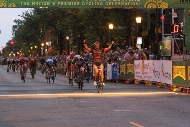 Highlights of the men’s race were stage wins by legendry Argentinian sprinter J.J. Haedo (Jamis Hagens Berman p/b Sutter Home), who rode for WorldTour teams Saxo Bank for the past four years and CSC two years before that. Wins at the flat Saint Paul and Minneapolis Criteriums were no surprise, but he had his hands full in Stillwater, where the finish was at the top of the 24% grade Chilkoot Hill that the riders had completed 20 times over the course of an hour.