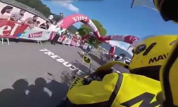 Watch as Orica-BikeExchange’s Adam Yates races toward the finish only to be taken out by the collapse of the inflatable banner at the precise moment that he rode under it. Despite crashing and injuring his chin, Yates earned the white jersey.
