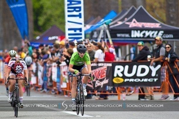 Watch the final sprint of the San Dimas Stage Race Women’s Criterium as Megan Jastrab (Swami’s Jr Development), who was leading the Sprint and U-25 competition, powered to victory, despite a hard charging Holly Breck (Sho-Air TWENTY20) . It was a close finish that ended with a bike throw at the line, in which Jastrab came out on top. Christina Birch (SkyFlash Racing) finished 3rd to round out the podium.
