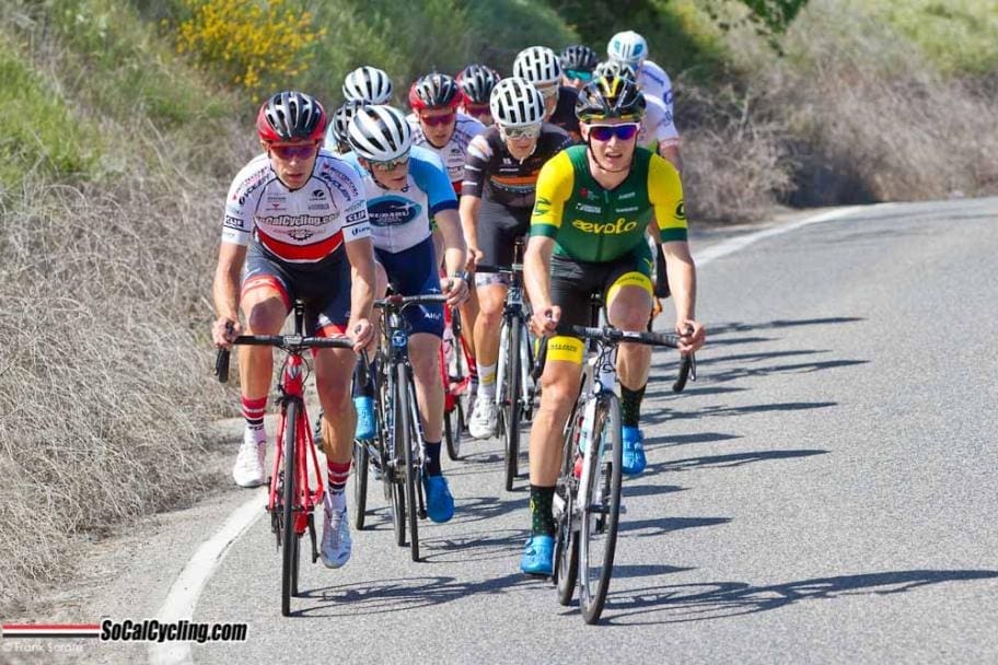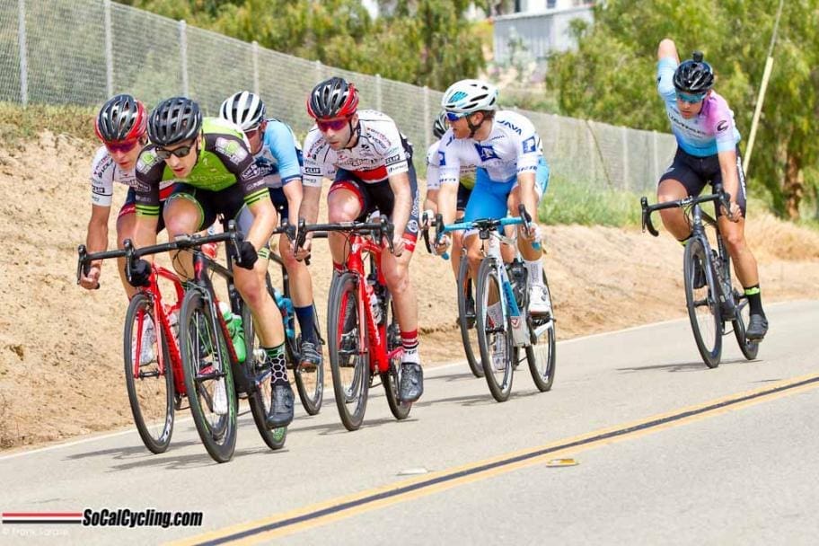 The first lap, I covered moves with my SoCalCycling.com Team teammate Leo Bugtai in the front of the field. After 6 miles, Ben Foster (SoCalCycling.com Team) went away with a few guys and not long after Chase Goldstein (SoCalCycling.com Team) bridged with a few guys as well. Perfect! We had two teammates in the break exactly as planned. Leo, Ethan Batt and I went to the front of the peloton and covered moves so we had the opportunity to free ride to the break if somebody was strong enough to bridge.