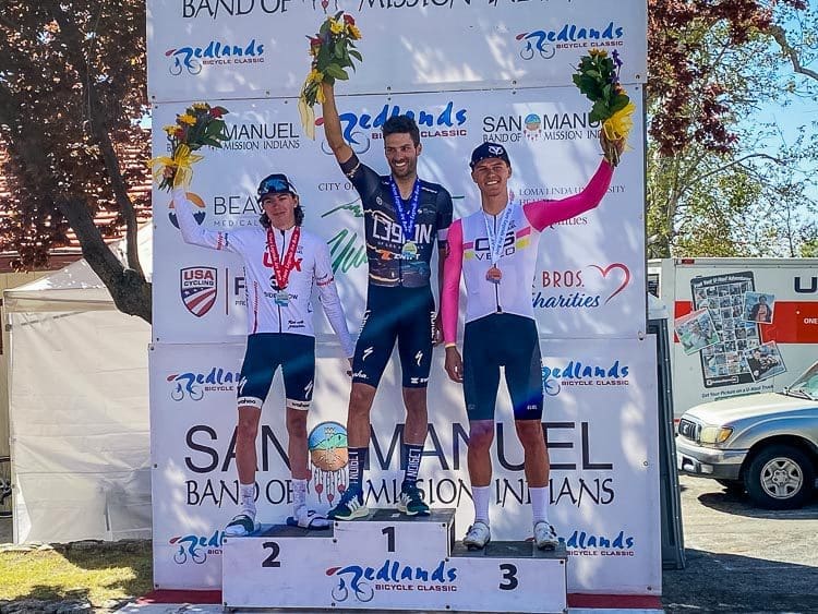 Australian Freddy Ovett won the City of Yucaipa Road Race today after an exciting attack in the closing meters of the brutal uphill finish to Oak Glen. The L39ion of Los Angeles rider timed his final move perfectly to take victory ahead of LUX Cycling’s Jesse Maris and Xander White from CS Velo, and now leads Redlands Bicycle Classic by a slim four-second margin ahead of Maris, who moves into the Best Amateur jersey after an incredible performance on junior gears.