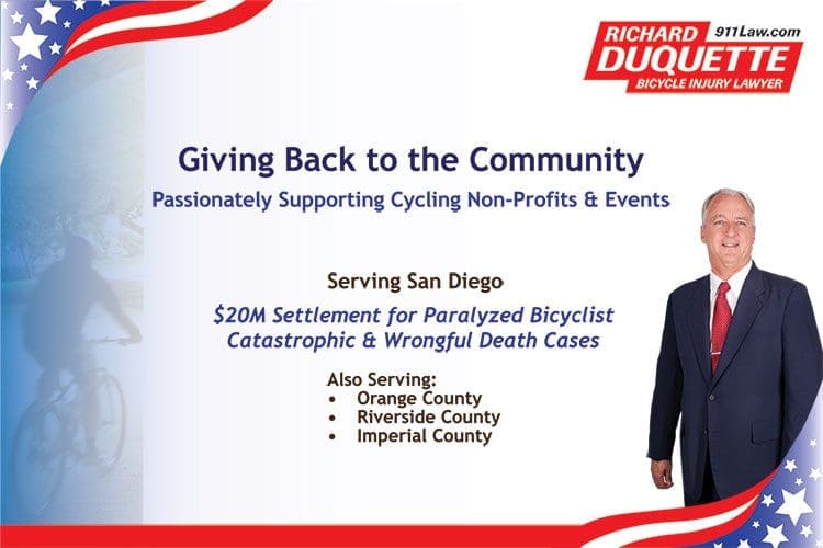 The Law Firm of Richard L. Duquette and Attorney Richard Duquette has been fighting for full justice for bicyclists for 38 years as an experienced and successful trial lawyer. Over the years, the Law Firm of Richard L. Duquette has contributed to the bicycling community including in 2022 to Non-Profits helping kids learn bicycle mechanics skills and lessons that hard work and literacy are rewarded, buying adaptive sports wheelchairs & sponsoring sports events!