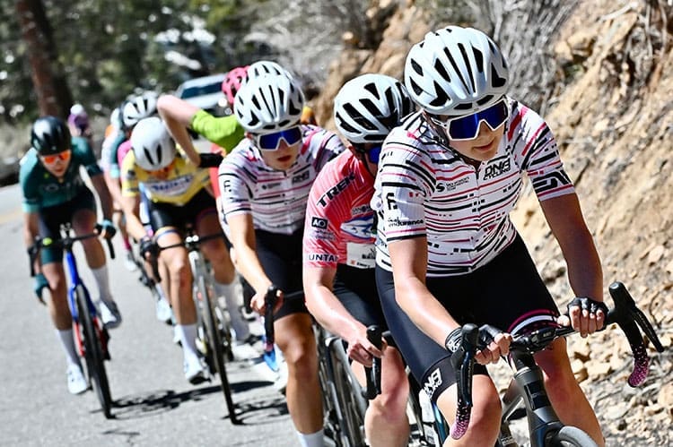 The women raced for 40 miles, going full gas from kilometer zero. DNA Pro Cycling were one of several teams that had their riders warm up on the trainers prior to the roll out. The peloton saw the first and only intermediate sprint of the day at 5-miles into racing. Marlies Mejias of Virginia’s Twenty24 was first to jump, out sprinting her rivals to earn the first green jersey of the Redlands Classic. Many teams in the bunch were focused on the climb ahead, conserving their legs for the long trek up the mountain.