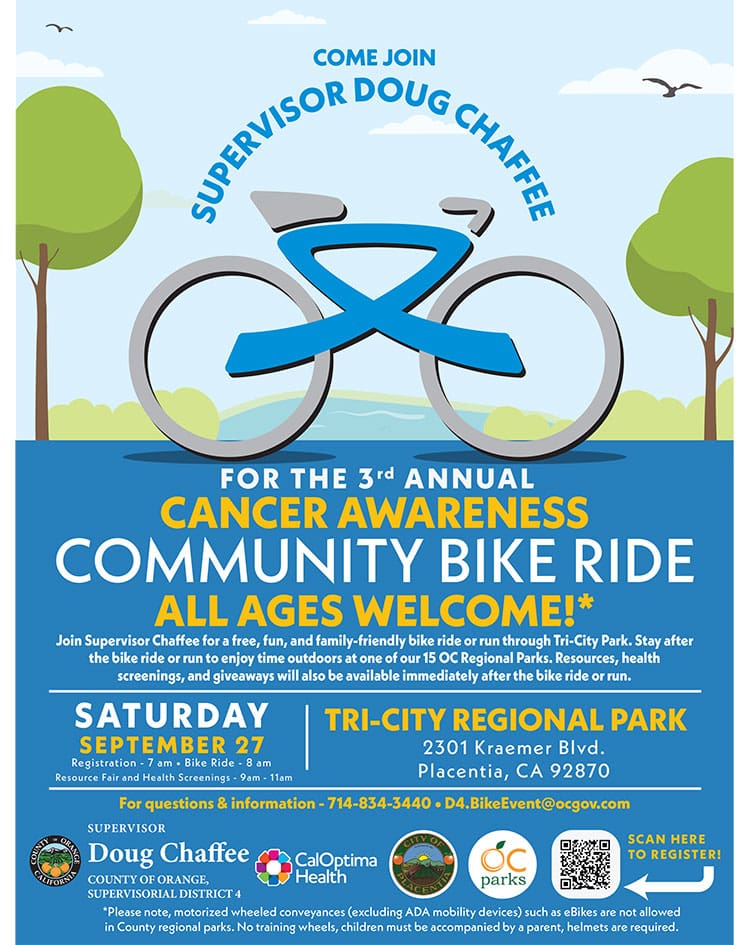 Mark your calendars for Saturday, September 27, 2025 at Tri-City Regional Park in Placentia, CA. Supervisor Doug Chaffee invites you to be part of the 3rd Annual Cancer Awareness Community Bike Event—a fun, family-friendly day dedicated to raising awareness for prostate cancer and supporting those affected by all forms of cancer.