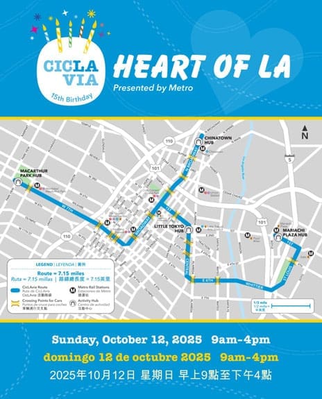 CicLAvia—Heart of LA invites Angelenos to enjoy 7.15 miles of car-free streets, connecting some of the city’s most historic neighborhoods, including MacArthur Park, Downtown LA, Chinatown, Little Tokyo, the Arts District, East LA, the 6th Street Viaduct, and Mariachi Plaza. Open to all ages and abilities, the event encourages walking, cycling, roller skating, or simply relaxing and exploring the city in a new way.