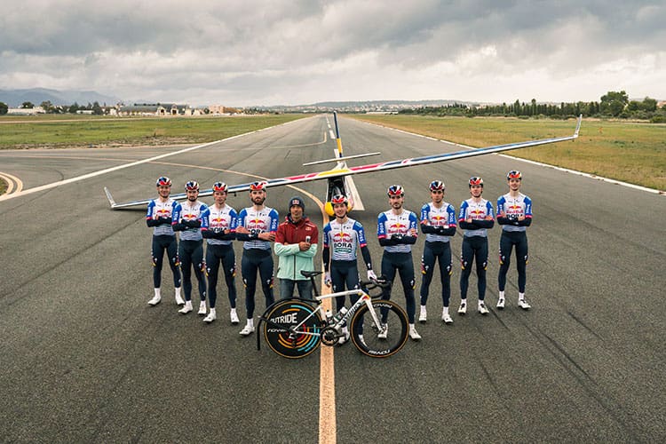 Red Bull is known for pushing the limits of human performance. Nine riders from Red Bull – BORA – hansgrohe have now made history by becoming the first people to launch a plane off the ground using pure muscle power. The scene of this feat was Son Bonet aerodrome in Mallorca.