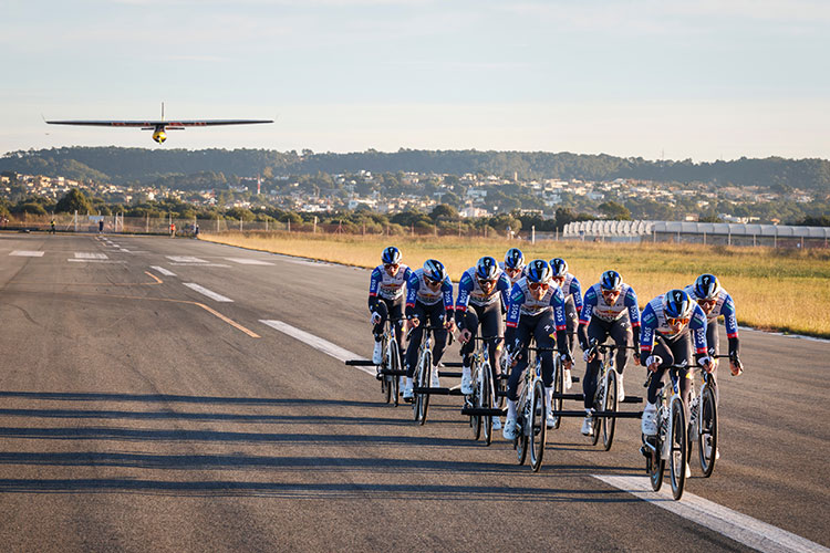 The ingredients for this spectacular record: a glider and its pilot, a 1,500-metre runway and a total of 6,500 watts of power generated by nine riders connected by a special belt. Florian Lipowitz, Nico Denz, Jordi Meeus, Tim Van Dijke, Laurence Pithie, Adrien Boichis, Davide Donati and Gijs Schoonvelde formed the team that pedalled in a ‘Husky formation’ for around 90 seconds to accelerate the plane to 54 km/h. It ultimately reached an altitude of 100 metres.